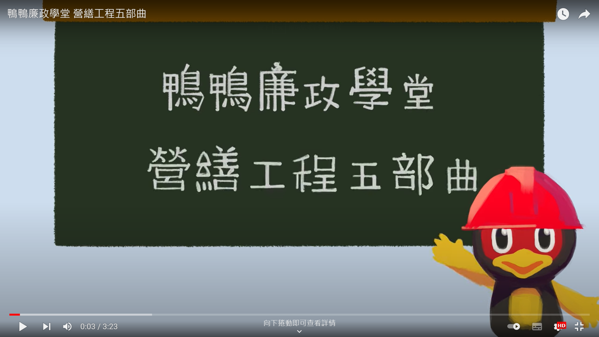 《鴨鴨廉政學堂-營繕工程五部曲》動畫與繪本,是縣府首次針對國小高年級以上學子與從事工程採購業務人員製作的誠信教材,由政風處依據專案稽核所發現之缺失態樣為素材編寫而成之故事教材,並與屏東大學視覺藝術學系團隊共同協力完成。