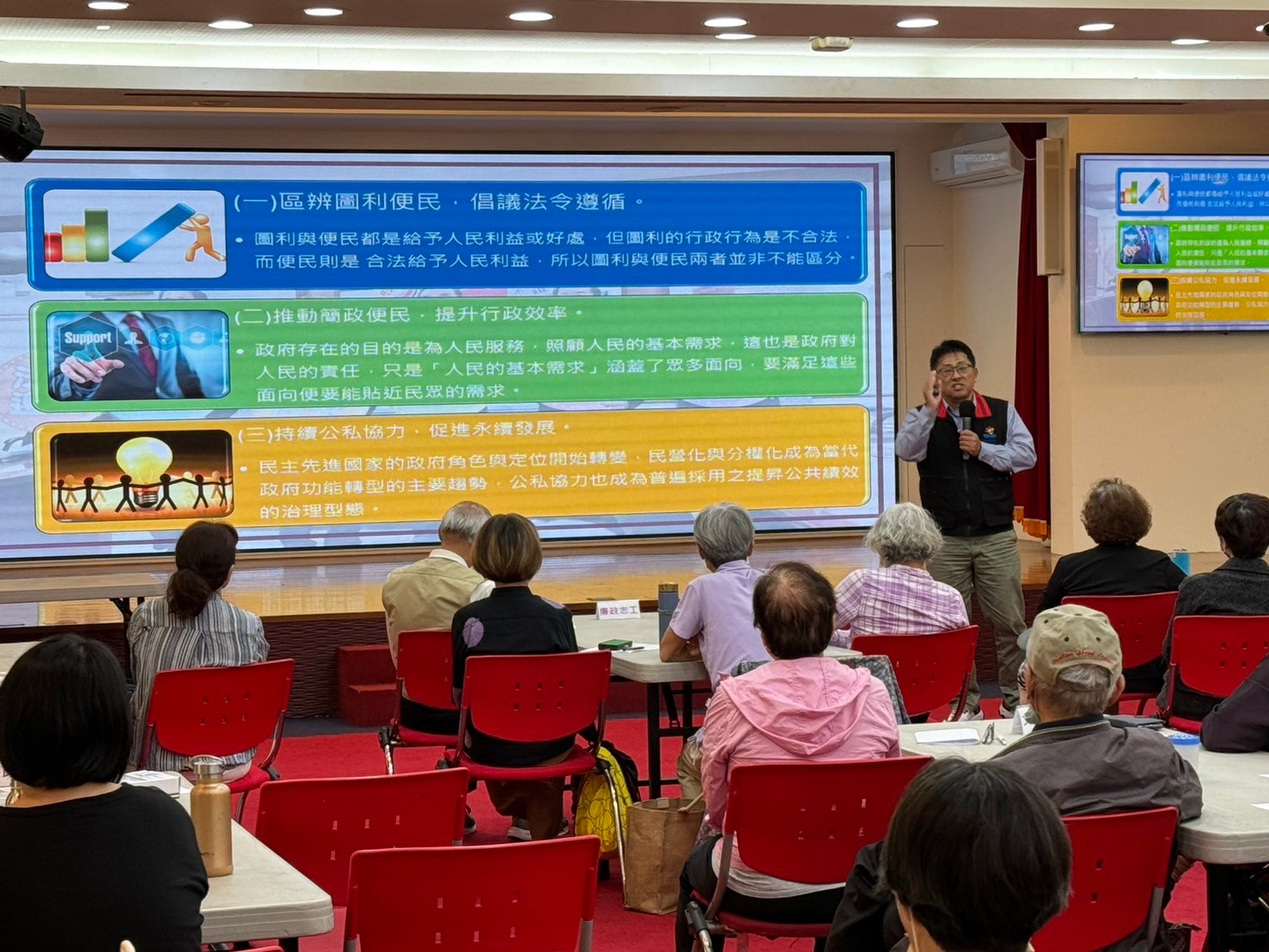 本次訓練由花蓮縣政府政風處處長林木本至現場勉勵志工夥伴,同時感謝志工對於廉政服務工作的投入及付出,亦肯定廉政志工服務的價值,課程開始由預防科針對「廉政業務重點」簡要說明,向志工夥伴報告113年度廉政志工業務的推動進度與成果,也感謝夥伴協助政風處深入學校、鄰里間宣導誠信倡廉訊息,另外,「廉政平臺業務」介紹「機關採購廉政平臺」,其成立目的為縣內重大建設工程品質把關,杜絕外界不當干擾,協助機關同仁依法行政,另「企業服務廉政平臺」則透過與企業雙向交流,彙整企業反應意見、破解圖利與便民迷思,經由公私協力跨域合作,實現企業重視商譽與誠信治理。
