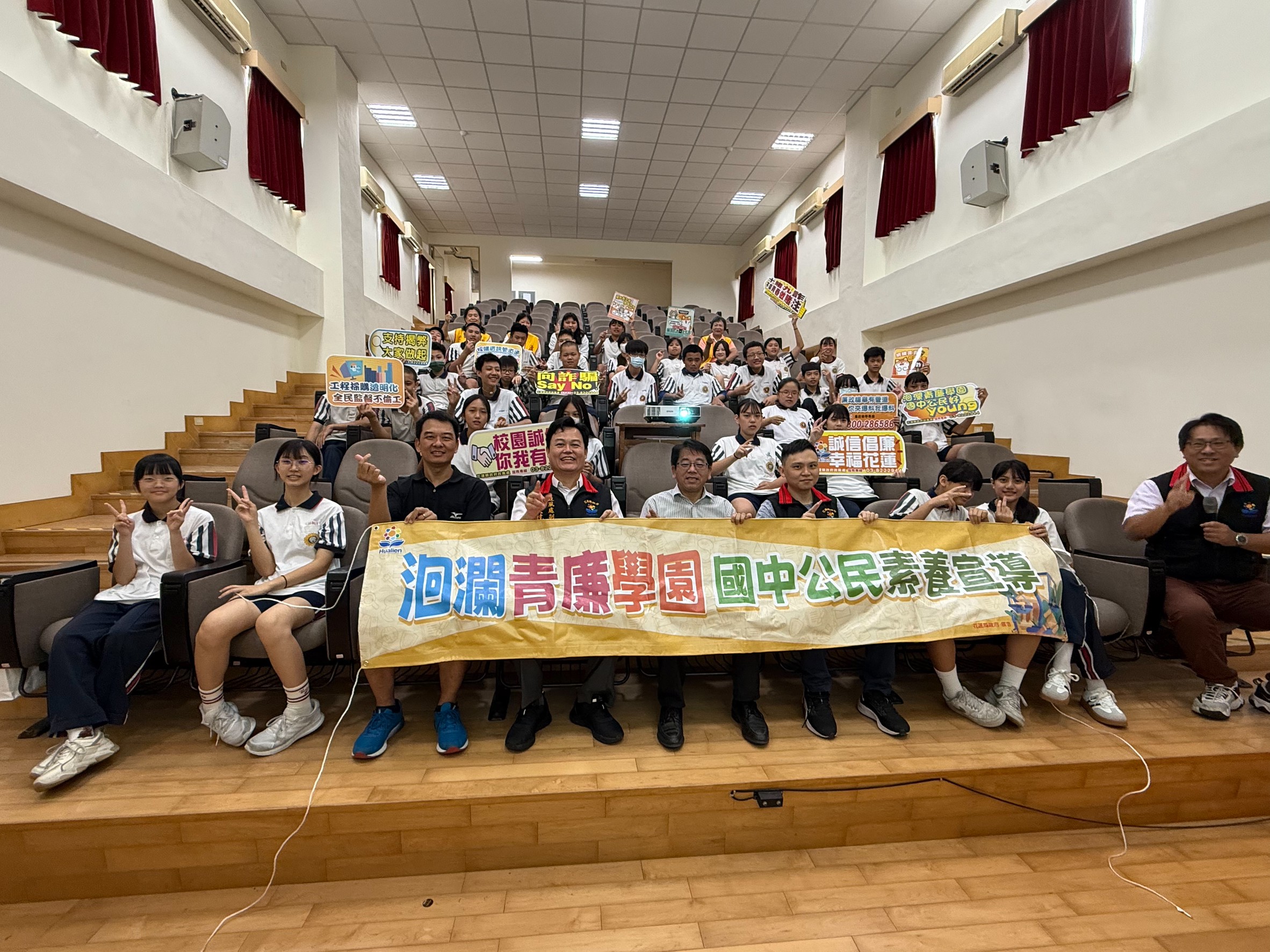 本次宣導活動由花蓮縣政府政風處主辦,結合校方課程設計,內容涵蓋反詐騙知識、誠信教育、廉政政策介紹及公益揭弊者保護法等主題,藉由生動的案例解析與有獎徵答互動方式,使學生在輕鬆氛圍中學習並建立法治觀念,辨識各類詐騙手法及面對誘惑時的正確抉擇。