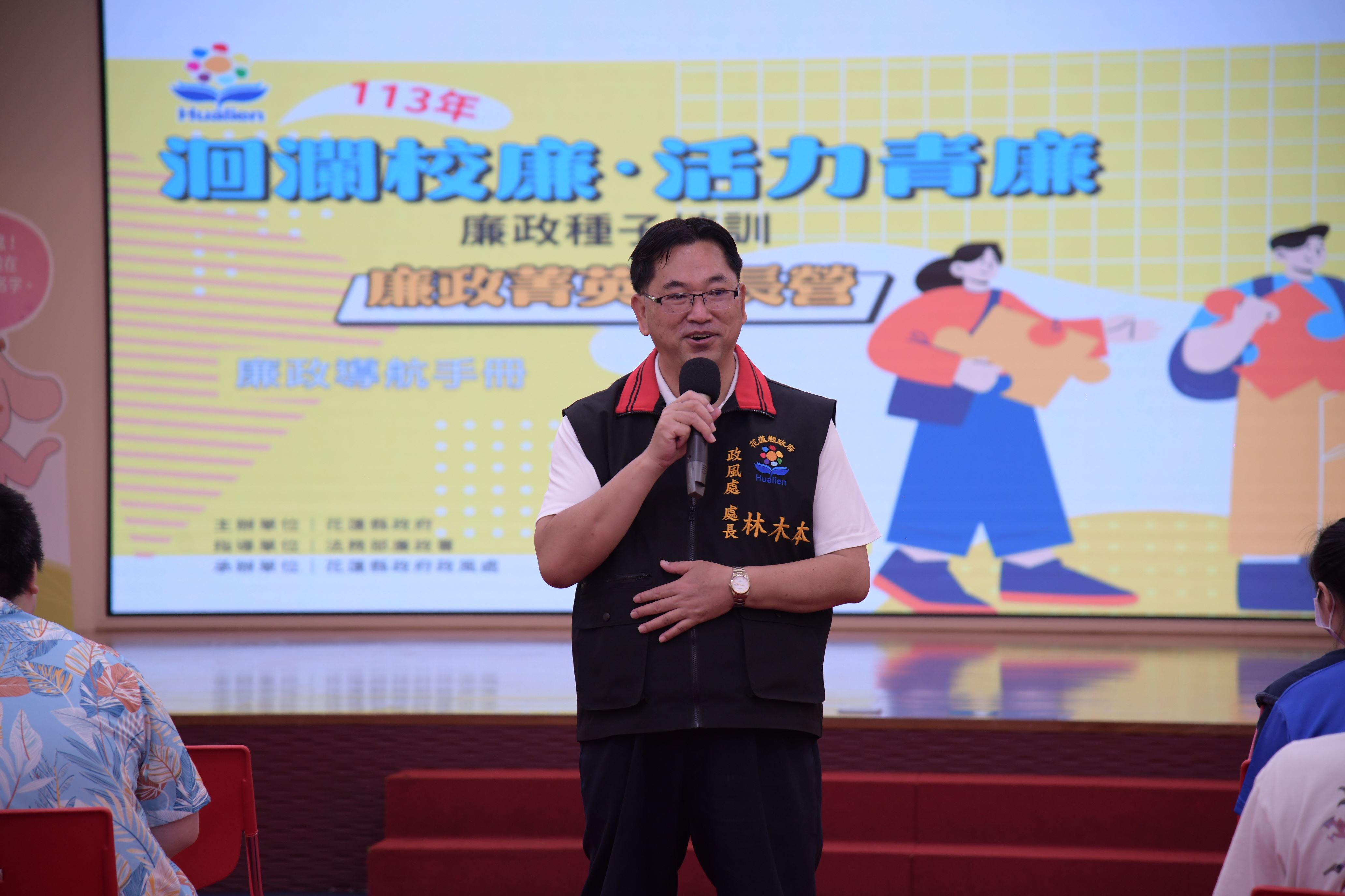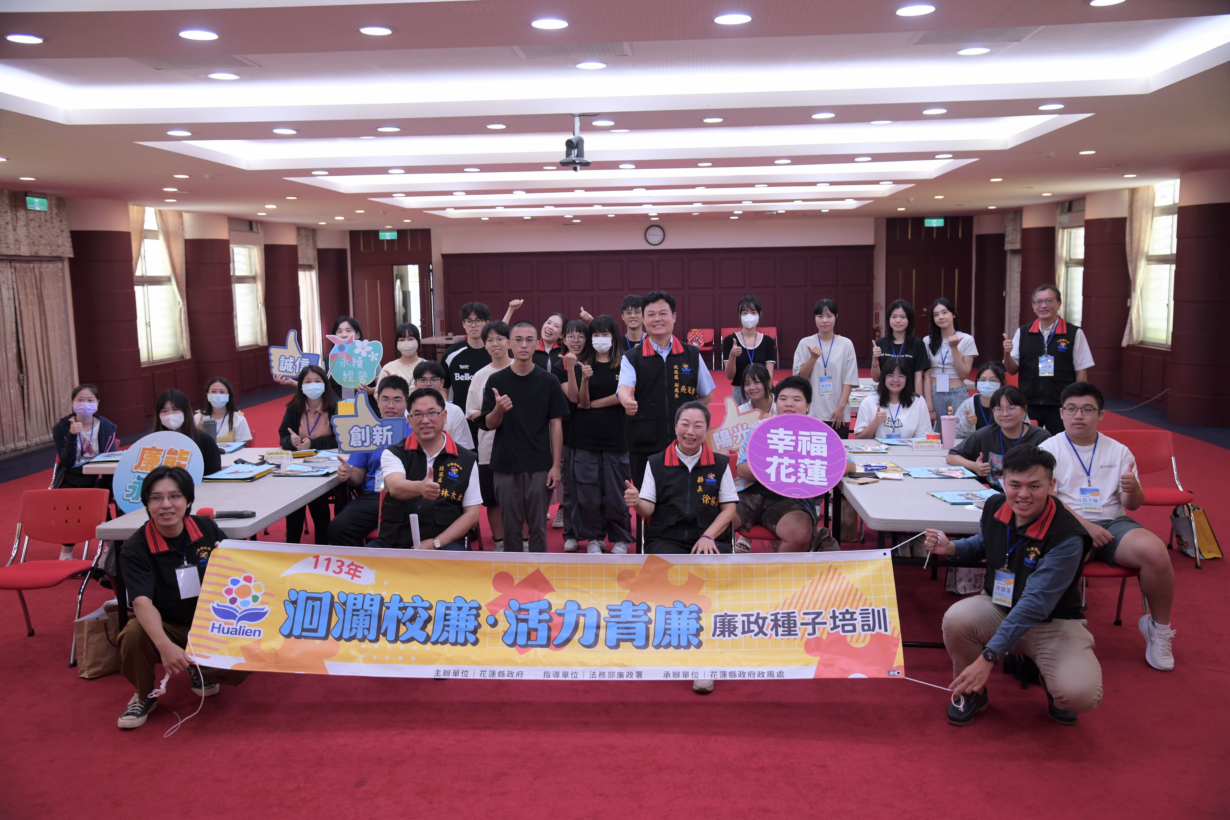 為喚起本縣大專院校學生對於廉潔、誠信、端正之品德及操守等價值觀,建立校園廉政種子,花蓮縣政府政風處於於今(19)日舉辦「113年度花蓮縣校園廉政菁英成長營」。本次活動吸引了眾多大專院校在校生及即將進入大學的青年學子參加,縣長不僅親臨現場致詞,更親自接待了縣府導覽列車的第一站—縣長室訪問,展現對年輕世代推動廉政意識的重視。