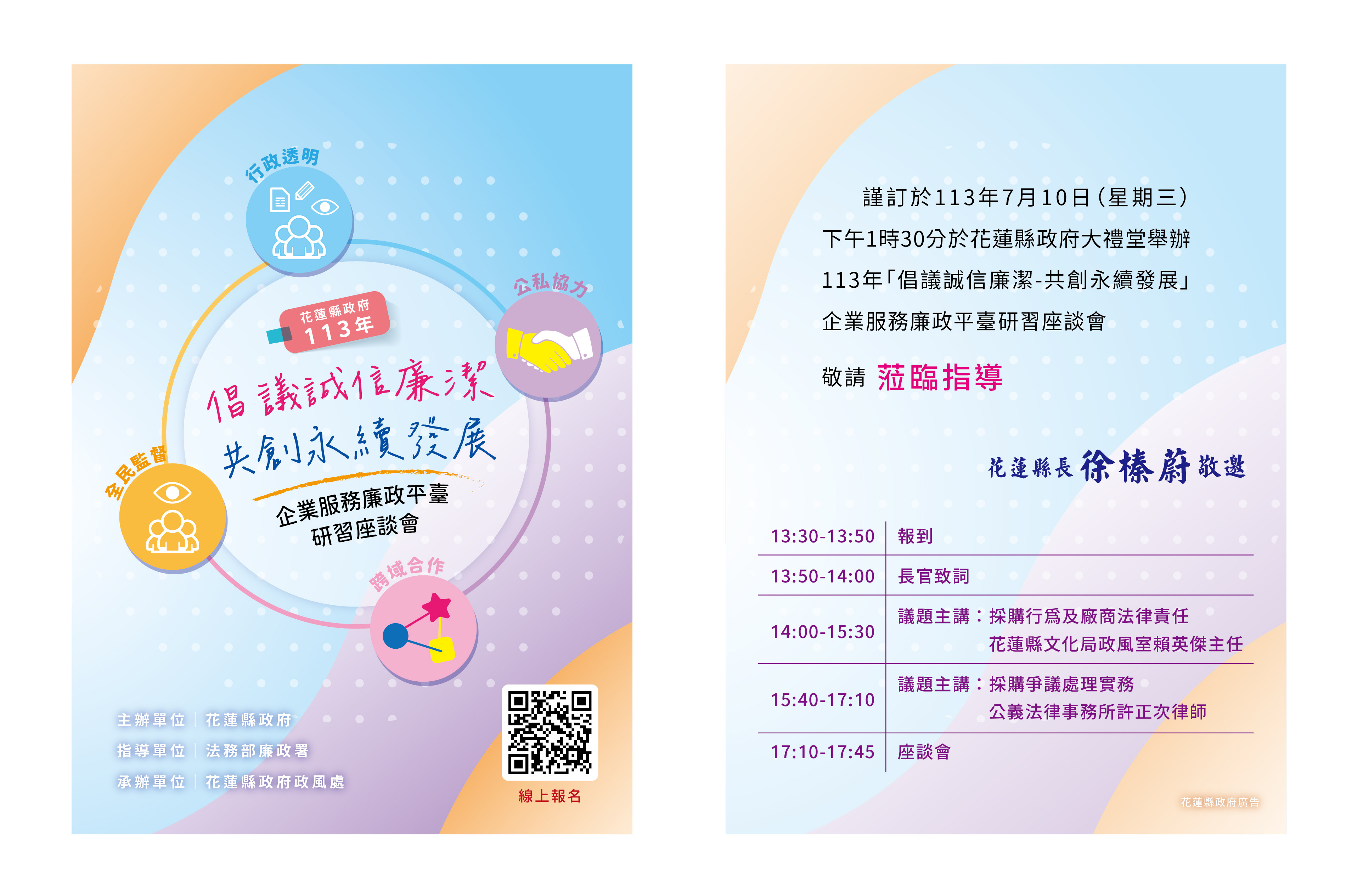 花蓮縣政府113年「倡議誠信廉潔.共創永續發展」企業服務廉政平臺研習座談會,歡迎各界先進共襄盛舉