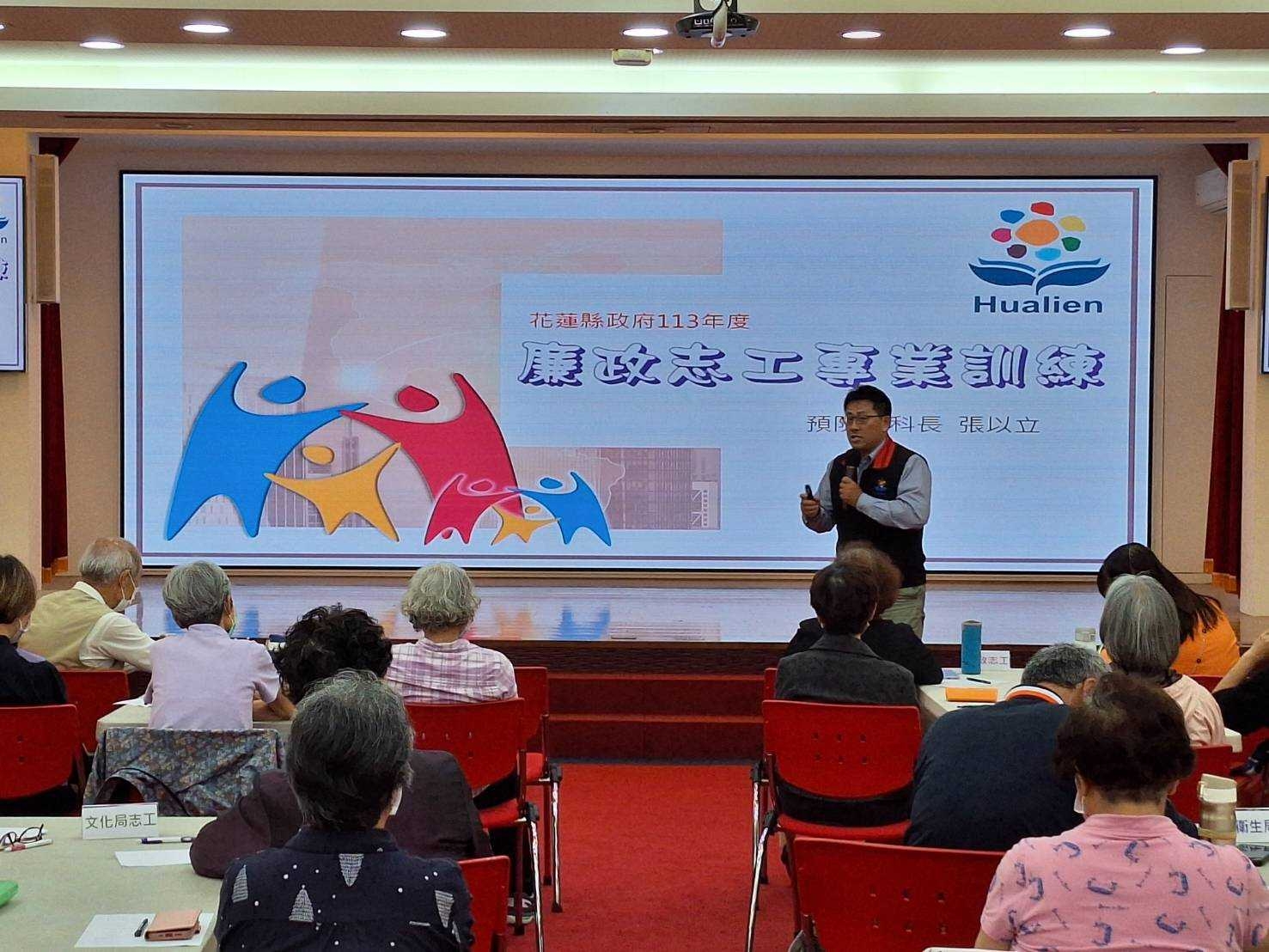 為提升花蓮縣政府廉政志工專業知能及凝聚向心力,促進民眾參與及投入廉政志願服務工作,發揚公民精神,帶動廉潔風氣,共同實踐社會參與。縣府政風處於5月23日大禮堂舉辦「113年廉政志工專業訓練暨聯繫交流會議」,並邀請文化局及衛生局志工一同參加,透過本次訓練及經驗交流,建立民間與政府的反貪腐夥伴關係,促進透明與貪腐零容忍的共識,增進廉政志工專業與凝聚反貪共識,並帶動廉潔風氣。