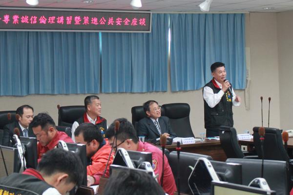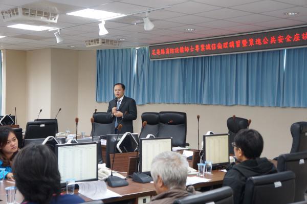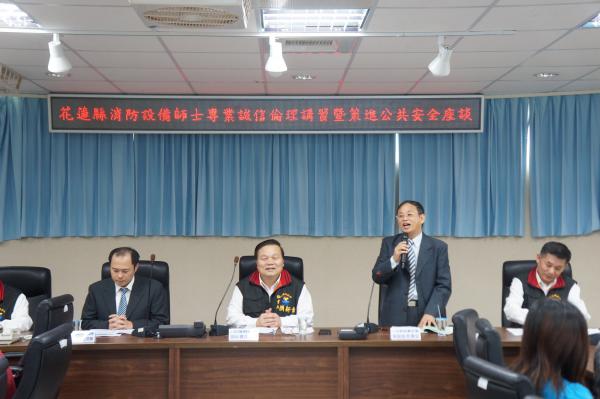 花蓮縣政府為響應1209國際反貪日,今(30)日特別邀請有關消防公共安全公私部門專業人員,於本縣消防局辦理「消防設備師(士)專業誠信倫理講習暨策進公共安全座談」,由縣府顏新章秘書長、法務部廉政署葉傳發副組長共同主持,邀請本縣消防工程器材商業同業公會彭宏進副會長及消防設備師(士)等50餘位業界代表與會,會中並敦請請花蓮地檢署詹常輝主任檢察官進行「消防公共安全與職業誠信倫理探討」專題演講。綜合座談時,所有與會代表和業界代表由法務部廉政署、消防局及建管單位擔任與談人,就「消防安全設備圖說審查暨竣工查驗、檢修申報與複查」等議題,進行討論與溝通,務期透過專業人員參與,讓各項消防安檢作為、規定,建置標準透明程序,提供縣民與業者明確遵循,確保民眾生命財產安全,活動並於中午12時30分圓滿結束。