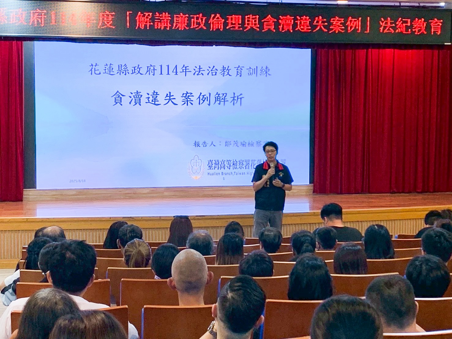 花蓮縣政府為深化所屬機關學校人員的法紀意識與廉政觀念,於今(18)日假衛生局大禮堂舉辦「解構廉政倫理與貪瀆違失案例」法紀教育講習,吸納本府各局處、公所及學校等單位約100名同仁參與。