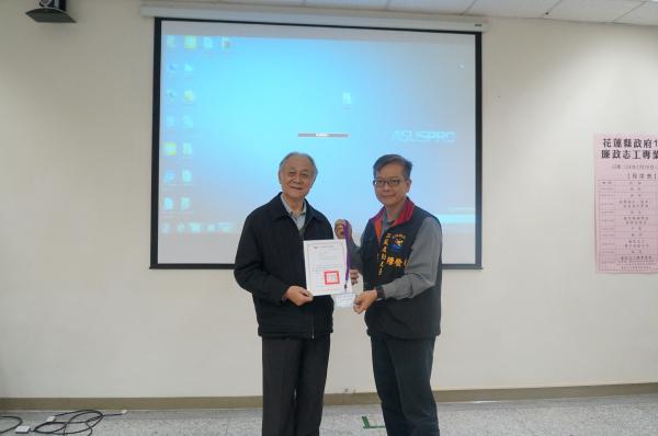 在訓練課程結束後隨即召開「廉政志工聯繫會報」,透過會報是可以強化志工溝通管道及建立服務共識。會中除針對縣府108年廉政業務推動重點進行說明外,亦舉辦志工授證儀式。由志工服務隊隊長邱俊雄先生擔任受證代表,政風處陳副處長代縣長徐榛蔚頒授。