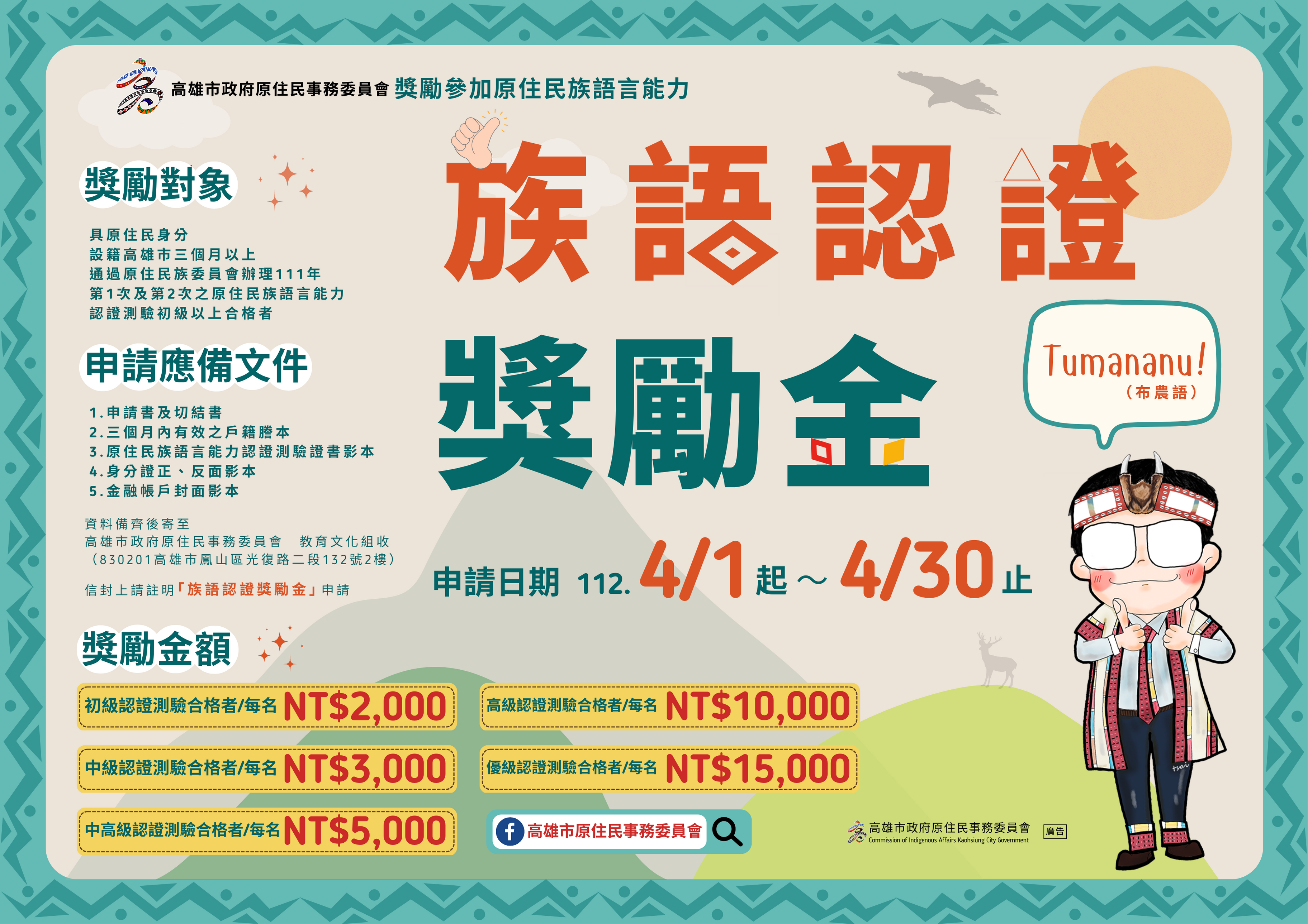 高雄市政府原住民委員會辦理參加原住民族語言能力認證測驗獎勵申請書及宣傳海報(112年4月1日至4月30日)