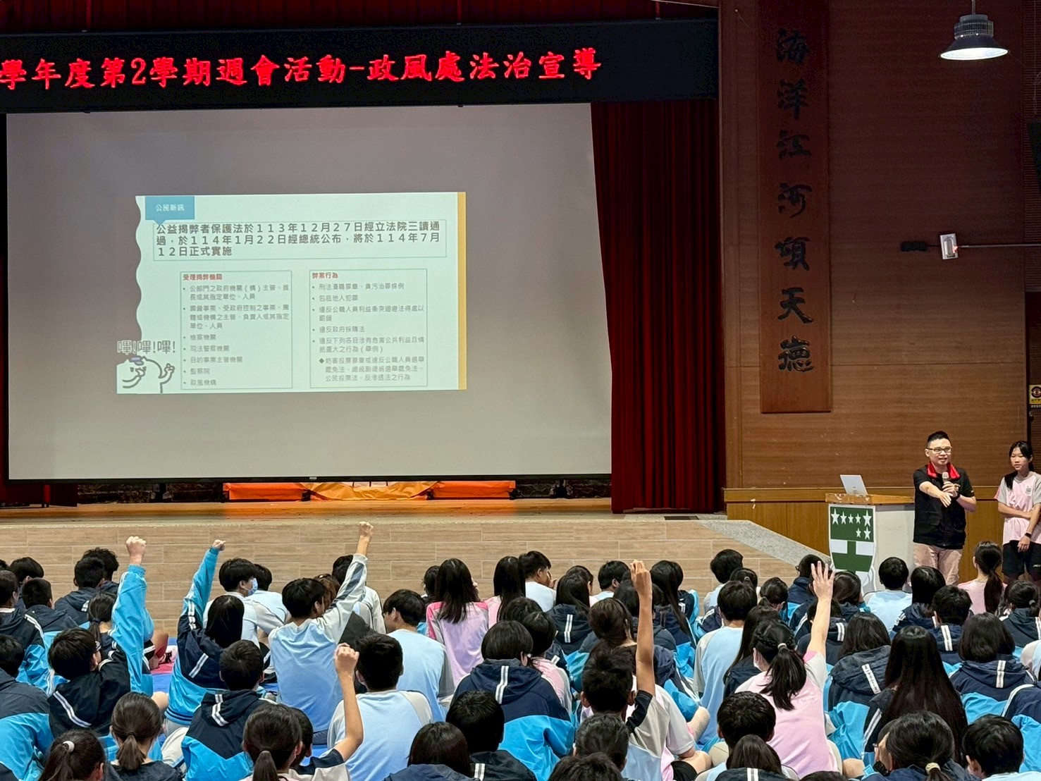 此系列宣導不僅由專業講師及結合趣味相聲進行宣講,內容更結合近年社會關注的時事新聞與法律新知,例如「公益揭弊者保護法」的修法重點,協助學生了解揭發不法行為者的保護機制,並透過實際案例強化學生的法律意識與公民責任感。