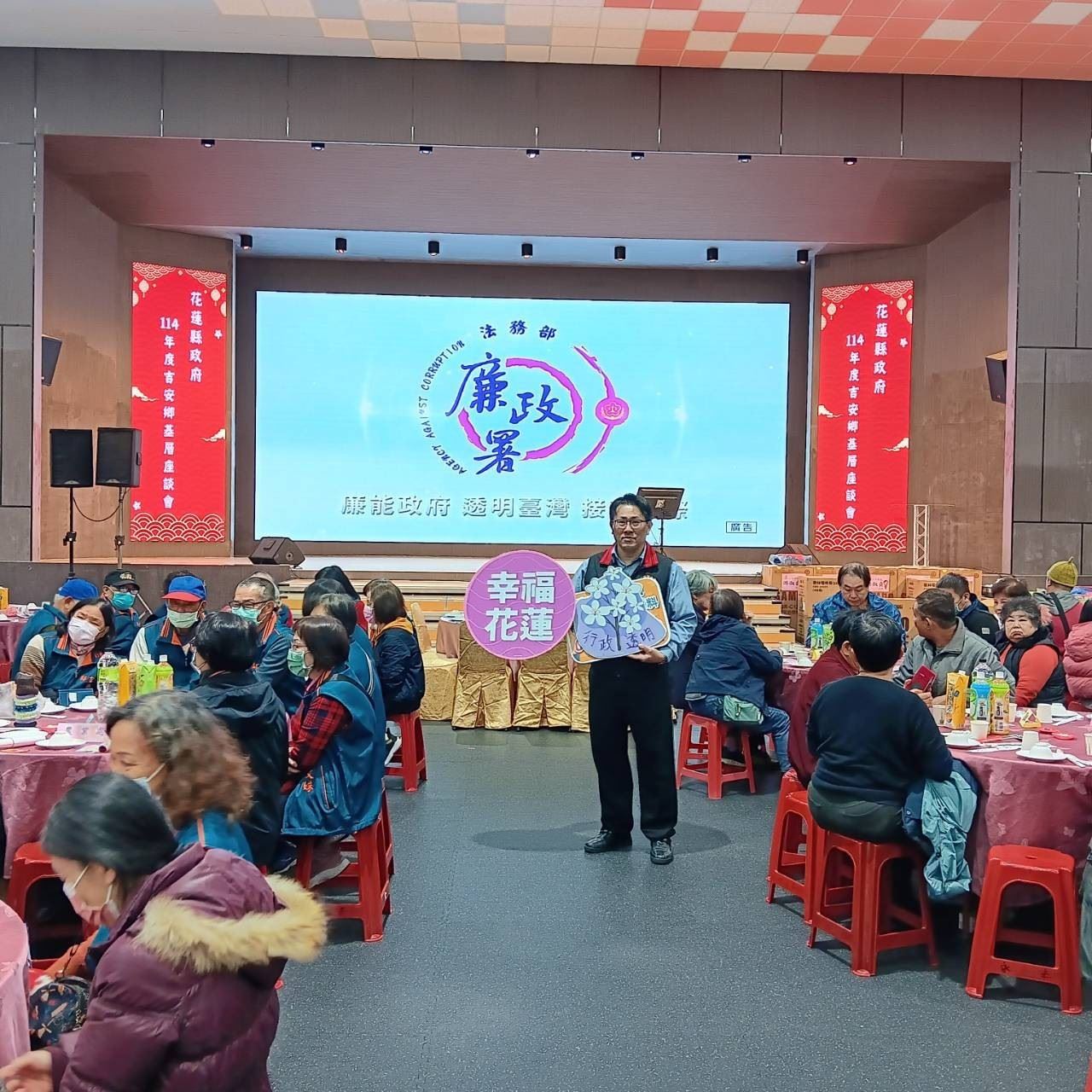 花蓮縣政府政風處配合「114年各鄉鎮市基層座談會暨政令宣導」最終站於昨(15)日假吉安國小學生活動中心進行反貪、綠能行政透明宣導,政風處遵循「聯合國反貪腐公約」第13條規定,政府應採取適當措施推動公部門以外之民眾、團體及企業等,共同參與預防和打擊腐敗,提供公眾對腐敗存在、根源及嚴重性威脅之認識,本次宣導攤位超過50位以上村(里)鄰長熱情參與廉政答題活動,同時與政風同仁手持標語大聲喊出「行政透明、幸福花蓮」廉政口號,對縣府的清廉施政行政透明表示肯定。